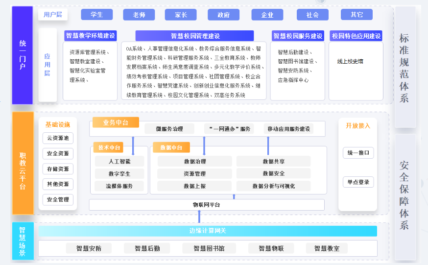结合高等学校信息化发展实际,以标准规范促进教育信息化支撑引领教育现代化发展,指导各高等学校充分利用云计算、大数据、物联网、移动互联网、人工智能等技术,搭建各类业务应用系统,实现系统建设的集成和数据融合,并利用大数据技术提升科学决策和教育治理能力,促进高等学校智慧化转型。 广州硕文教育携手多所高校,深度合作建设了多期项目,在基础设施方面,智慧教室助推教学方式方法变革、提高课堂教学质量;在业务系统方面,通过三期的建设,中大教务已全面支持教改,高度兼容,赢得了全校师生的好评。建设国家高等教育质量常态监测数据平台,为全面上千所高校提供服务……在公共服务方面,统一服务门户为全校师生提供了极致的办事、信息、日程管理、应用集成服务,深刻贯彻“服务找人、千人千面”的理念,获得超高的用户访问量。一表通则实现填表数据预填充,简化填表过程,为中大“最多填一次”赋能;在数据治理方面,丰富的大数据应用为领导决策、业务管理和学生关爱提供数据支撑。